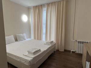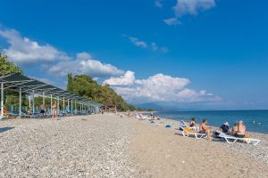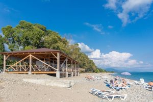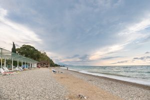 В 5 минутах ходьбы находится городской мелко-галечный пляж. На побережье установлены раздевалки, есть навесы, работает прокат шезлонгов и зонтиков.