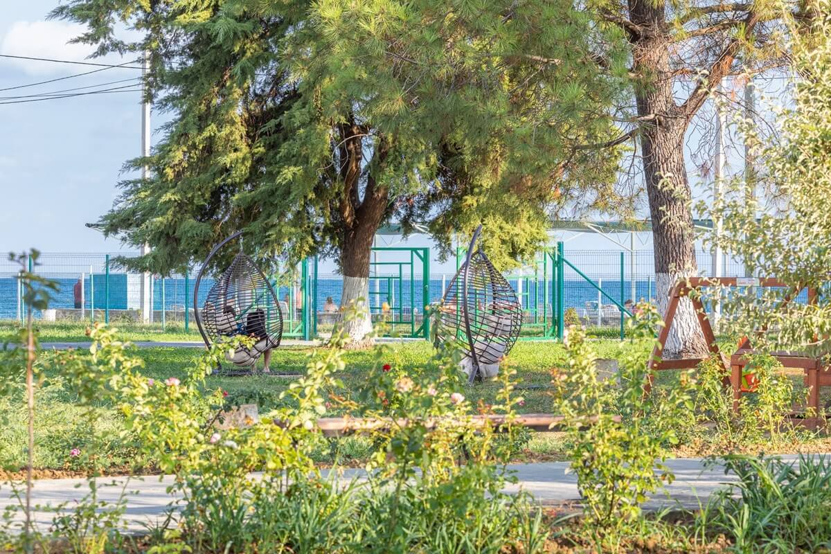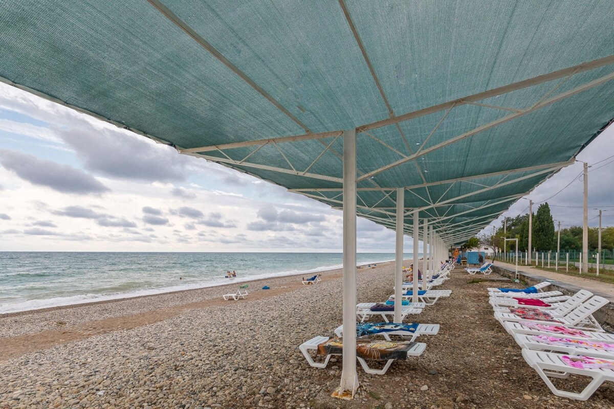 В 5 минутах ходьбы находится городской мелко-галечный пляж. На побережье установлены раздевалки, есть навесы, работает прокат шезлонгов и зонтиков.