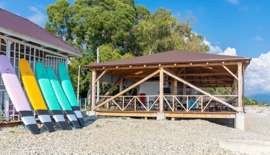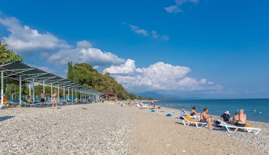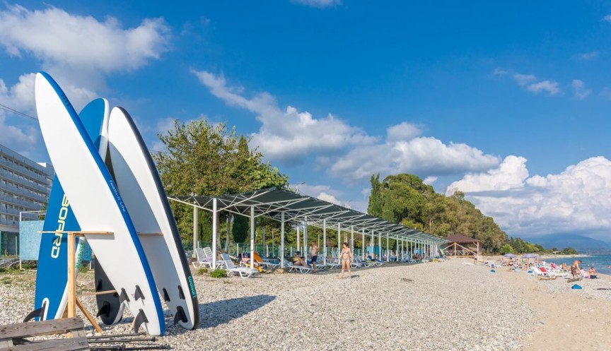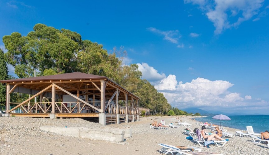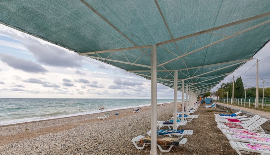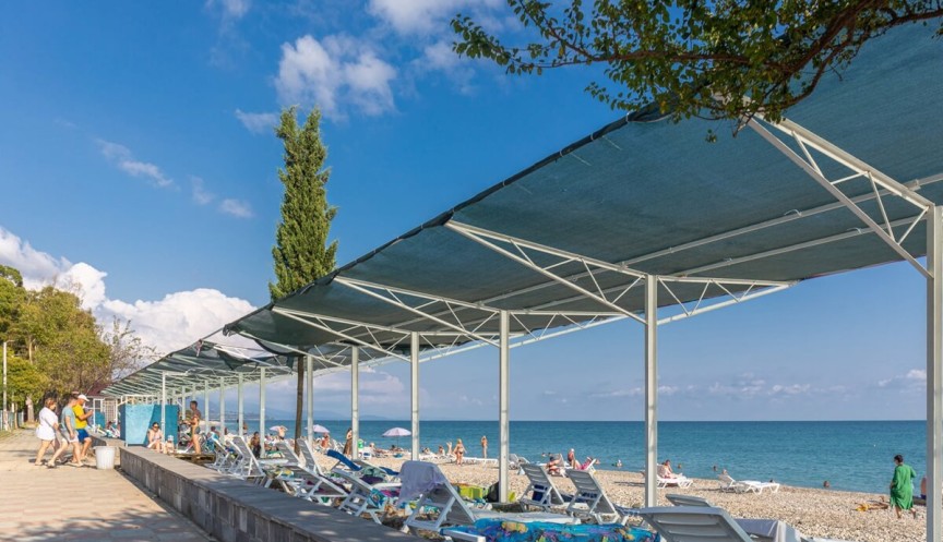 На побережье установлены раздевалки, есть навесы, работает прокат шезлонгов и зонтиков.